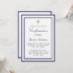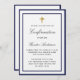 A modern, elegant and confirmation invitation. A white background decorated with royal blue frames and a golden cross. Personalise and add a name and details. Black coloured letters.