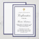 A modern, elegant and confirmation invitation. A white background decorated with royal blue frames and a golden cross. Personalise and add a name and details. Black coloured letters.
