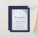A modern confirmation invitation. On a navy blue rectangular background, it has a faux silver foil arch that has inside navy blue text on white background. The word Confirmation and the name are written in an elegant calligraphic script; the first line is arched text.