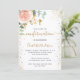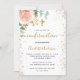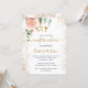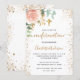 A white background decorated with eucalyptus greenery, a rose gold and blush pink rose, and golden leaves and faux gold glitter drops. Personalise and a name and ceremony details. Black and golden coloured letters.