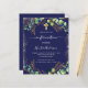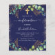 A navy blue background decorated with eucalyptus greenery and golden leaves and faux gold glitter sparkles. A golden cross. Personalise and the child's name and ceremony details.