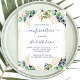 On the front: A white background decorated with eucalyptus greenery and golden leaves and faux gold glitter sparkles. A golden cross. Personalise and the child's name and ceremony details. Blue text.