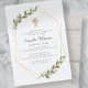 Design is composed of green greenery leaf foliage botanicals with faux gold geometric frames and adorned by a faux gold cross.