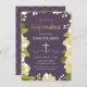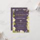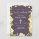 This modern and pretty confirmation invitation features an illustrated floral border and the word "Confirmation" in gold. The background is a purple (plum) colour, but can be customised to any colour you choose. The back of the invite includes a gold quatrefoil pattern with a matching purple background that can also be swapped out. The text is customisable for your special religious event.
