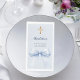 A light blue background colour. Decorated with a large light blue coloured bow and a golden cross. Personalise and add the name and date.