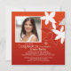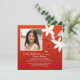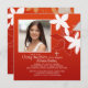 Against a red background exotic lilies "grow". The picture window is framed in white to accent your favourite photo. The white cross can be dragged to any location, made larger or smaller or eliminated making this a versatile invitation.