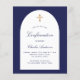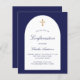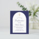 A navy background and a white arch frame. Personalise and a name and ceremony details. Elegant hand lettered style script.