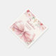 A cream, beige background colour. Decorated with a large pink bow and a golden cross and pink flowers. Personalise and add the name and date.