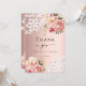 A modern and elegant Confirmation thank you card. A rose gold gradient background. Decorated with rose gold and blush pink roses, florals flowers, white lace and a golden cross. On the front the text: Thank You.