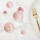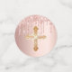 A rose gold faux metallic, foil looking background decorated with faux rose gold glitter drips. Personalise and add a date and name/event. Dark rose gold coloured letters. Some confetti chips with name and date, others with a cross. Add your own photo on two of the chips.