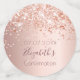 A rose gold background decorated with faux rose gold glitter dust. Personalise and add a date and name/event. Dark rose gold coloured letters. Some confetti chips with name and date, others with a cross. Add your own photo on two of the chips.
