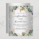 A faux silver looking background decorated with eucalyptus greenery and golden leaves and faux silver glitter sparkles. A golden cross. Personalise and a name and ceremony details.