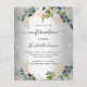 A faux silver looking background decorated with eucalyptus greenery and golden leaves and faux silver glitter sparkles. A golden cross. Personalise and a name and ceremony details.