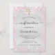 A modern, elegant confirmation, celebrating a girl. Faux silver metallic looking background decorated with pink faux glitter dust and a golden cross. Personalise and add a name and party details. Black coloured letters.