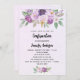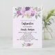 A violet, lavender watercolored background. Decorated with violet and purple watercolored flowers and greenery and a golden cross. Personalise and add your name and reception details.