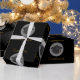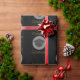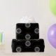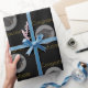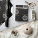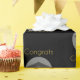 Wrapping paper for a graduation gift designed with a black graduation cap with a semi-transparent circle behind set on a black background. Congrats graduate written in a modern style font in gold.