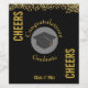 A bottle label which says Congrats Graduate and Class of 20xx. Cheers written on the side. Designed with a graduation cap on a semi-transparent white circle. Set on a black background. Faux gold coloured glitter confetti sprinkled across the top.
