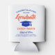 Add a personalised touch to college or high school graduation party decorations with orange and blue can coolers. Design features a white background, blue mortar board cap, stylish modern typography, handwritten style script calligraphy, and a customisable message reading "Congratulations to our Graduate". Text at the bottom includes class year, school name, and an optional line for degree, honours, or other info. All text is simple to customise. These elegant favours make a stylish graduation celebration drink idea. Cheers!