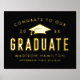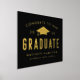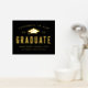 Modern graduation poster featuring bold gold foil lettering with a black background. The design features a gold foil graduation cap with the phrase "Congrats to our Graduate". Personalise the black and gold foil graduation sign by adding the graduate's name, school name, and graduation year. For a more custom look, change the background to your school colours. The foil graduation poster is perfect to use for your high school or college graduation party!