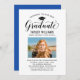 Elegant graduation announcement card and graduation party invitation congratulates and announces your grad in style! Features black grad cap, "Graduate" in script, and modern custom text that can be personalised with the graduate's name, school, and party details. Add a favourite photo of the grad. Note, the classic blue / navy accent colour on the back of the card can be changed to white or another colour that coordinates with the photo or party colours.