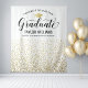 Elegant graduation party backdrop for photos features a gold coloured grad cap, "Graduate" in script, and modern custom text that can be personalised with the graduate's name and school. A pattern of gold falling confetti dresses up the background - perfect party prop for guests to stand in front of for pictures with the grad! Multiple Sizes are available.