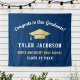Congratulate your graduate in style with a modern personalized graduation party photo backdrop sign, featuring their class year with gold colored grad cap, and sporty custom text for the grad's name, school, and class year. Navy blue, white, and gold colors can be customized to match your party colors.