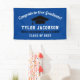 Congratulate your graduate in style with a modern personalised graduation banner sign, featuring their class year with black coloured grad cap, and sporty custom text for the grad's name, school, and class year. Cobalt / royal blue, black, and white colours can be customised to match your party colours.