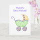 Make your own card and personalize with the baby's name. Great "Congratulations" card for a baby girl or boy with his or her name. This trendy greeting card features a light green and yellow baby buggy with the customizable words "Welcome Baby" and the name on the front. A row of lavender purple flowers is on the inside left side of the card with the right side having a customizable sentiment words personalized with the baby's name. The buggy is accented with lavender purple colors. This congratulations card coordinates with other products for baby in this store for a great shower gifts and other products. The buggy buggy is stylish, cute and whimsy original art by Phyllis Dobbs. Fully customizable.
