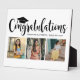 Stylish 3 photo graduation plaque display sign with easel features "Congratulations" in trendy black calligraphy script with grad cap and modern custom text for the graduate's name and class year. Add three favourite photos of the graduate to the square placeholder images. Clean white background colour.
