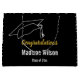 An outline of a graduate's cap is at the top. Under the cap, there's a template on this black, white, and faux gold gift bag. The template allows you to edit the display text. You can change the message, the year student is graduating, and the graduate's name. Faux (not foil) gold script forms the message. (Shown: Congratulations) White display text is available for the graduate's name and the year the student is graduating. (Shown: Class of 2021) A pattern of white text for the year the student is graduating is also on the sides of the gift bag.
