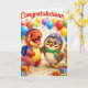 Description say a big well done with this vibrant and cheerful congratulations greeting card perfect for graduation school achievements or any proud moment it features a happy dinosaur with a backpack and an owl wearing glasses and a green scarf celebrating under a sky of colourful balloon balloons the festive scene complete with confetti and gift boxes is designed to bring a smile to anyone's face