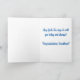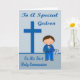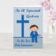 Congratulate your godson on his First Holy Communion with an adorable boy dressed in a blue suit with a bow tie and cute, pink flower on his lapel holding a Holy Bible. Background is blue with a dark blue cross and text.