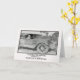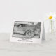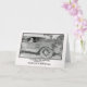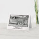 A vintage black and white photograph of a 1930's car with a dog at the wheel, and a water bag on the side. " Congratulations on getting your drivers license". Humour