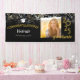 Personalise this modern graduation banner with your graduate's photo, name, school and year. The background is silver and gold confetti stars on black. The text appears in gold and white.