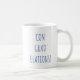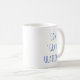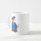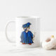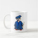 Ceramic mug features an original marker illustration of a graduate in a blue cap and gown, with CON 'GRAD' ULATIONS in a fun font.