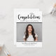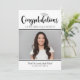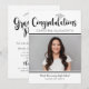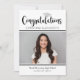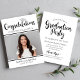 Celebrate your graduate with this modern black and white graduation party invitation featuring bold script “Congratulations” and a silver graduation cap accent. Add a favourite photo and customise the name and school details. The back side includes matching “Graduation Party” typography with clean, easy-to-read party information.