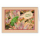 Tiny bright green reptile/lizard nestled amongst peach coloured tropical succulent plants. The caption in the "bubble" is "I'm green with envy. Inside, "Congratulations!"