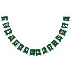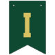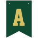 Modern and simple graduation party bunting banner features "Congratulations!" with grad cap accent Green bunting flags with alternating white and gold letters in serif varsity sports lettering style. Note, colours can be customised to match school colours or party colours.