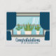 Congratulations on your new home. A beautiful happy housewarming postcard featuring a pretty windowsill filled with cute succulent plants. The window is covered with beautiful blue drapes above your congratulatory text.