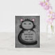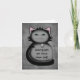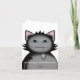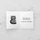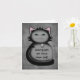 A sneaky looking kitty in black and grey holding a toy mouse on a note card that is worded as a fun congratulations card for a new cat owner.