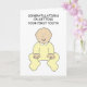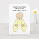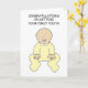 A cartoon of a cute baby in a yellow outfit, set against a crisp white background. The baby has one tooth showing. The words 'Congratulations on getting your first tooth' accompany the image.