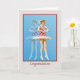 The lovely little ballerina strikes a twirling pose in her pink and white costume on background of blue. She is wearing white gloves and has a white ribbon in her hair. It makes a perfect image for congratulations on a dance recital.