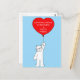 A cute white cat standing up holding a large red balloon, against a pale blue background The balloon has 'Congratulations on becoming a foster parent ' written on it.