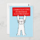 A very large cartoon fluffy kitten holding up a red sign that says 'Congratulations on becoming Class President'.