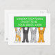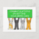 Four cartoon cats holding up a lime green coloured banner which says 'Congratulations on getting your green card'.
