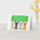 Four cartoon cats holding up a lime green coloured banner which says 'Congratulations on getting your green card'.