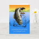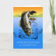 Congratulations on retirement for a cousin. Vintage fishing scene with retro wooden boat, two fisherman, large mouth bass, sunset, and big splashes in the lake water. Hazy green hills in the far distance. Art, image, and verse copyright © Shoaff Ballanger Studios.