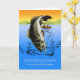 Congratulations on retirement for grandpa. Greeting card with vintage fishing scene of two fishermen in a boat catching a large mouth bass. The fish is splashing in the lake water and making waves. Retro scene with soft muted colour scheme. Sunset over green hills fills in the upper area. Art, image, and verse copyright © Shoaff Ballanger Studios.