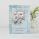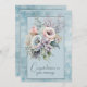 A beautiful blue and pink floral bouquet and leaves on a blue heart background and framed in two shades of teal.
