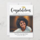 Celebrate your graduate with a modern black and white photo graduation party design featuring “Congratulations” in bold script and a gold grad cap accent. Personalise the name, photo, school, and class year. The back features matching “Graduation Party” script with clean party details and RSVP.